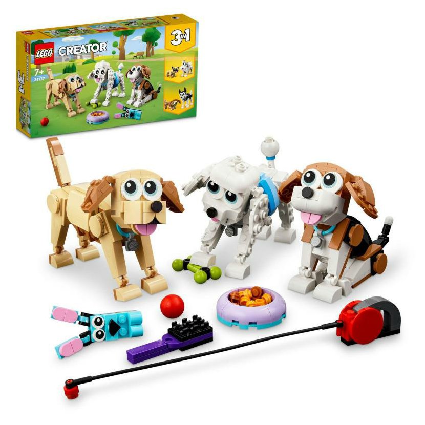 Milovníci psů a děti od 7 let si užijí legraci s rozkošnými chlupáči ze stavebnice LEGO® Creator 3 v 1 Roztomilí pejsci (31137). Mohou se těšit na bígla, pudla a labradora s pohyblivými hlavami, ocasy a ušima, a navíc také na nápadité doplňky, včetně misky, hřebenu, hračky v podobě králíka, balónku a vodítka, které dodají ještě více herních možností.